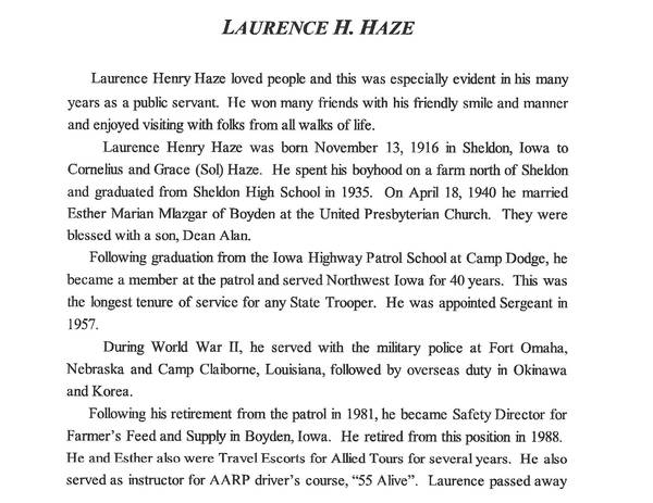 Laurence Henry Haze formerly of Sheldon, Iowa died August 29, 2013